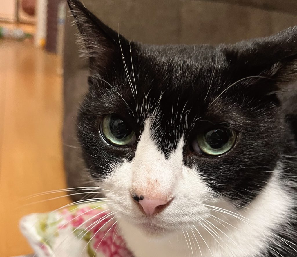 ハチワレ 黒と白 目の色はグリーンです