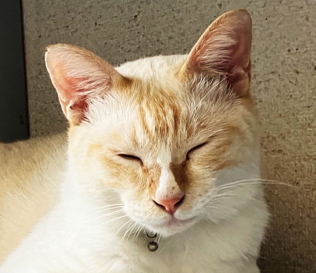 目が薄い青で、しっぽが短く先端が折れ曲がってます